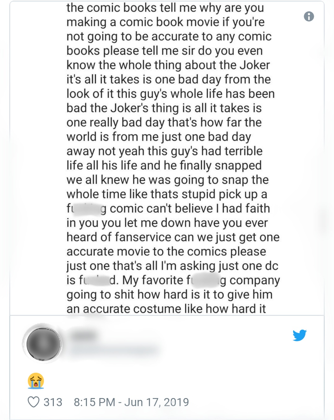 Just today I read about some toxic fan who vented his frustration (which is okay) and telling Todd Phillips aka the director of the upcoming solo Joker movie how Phillips had messed up the movie by not following the Joker's 'comic book story line'.....even told the director off for not staying true to the comic book story arc (not okay!).